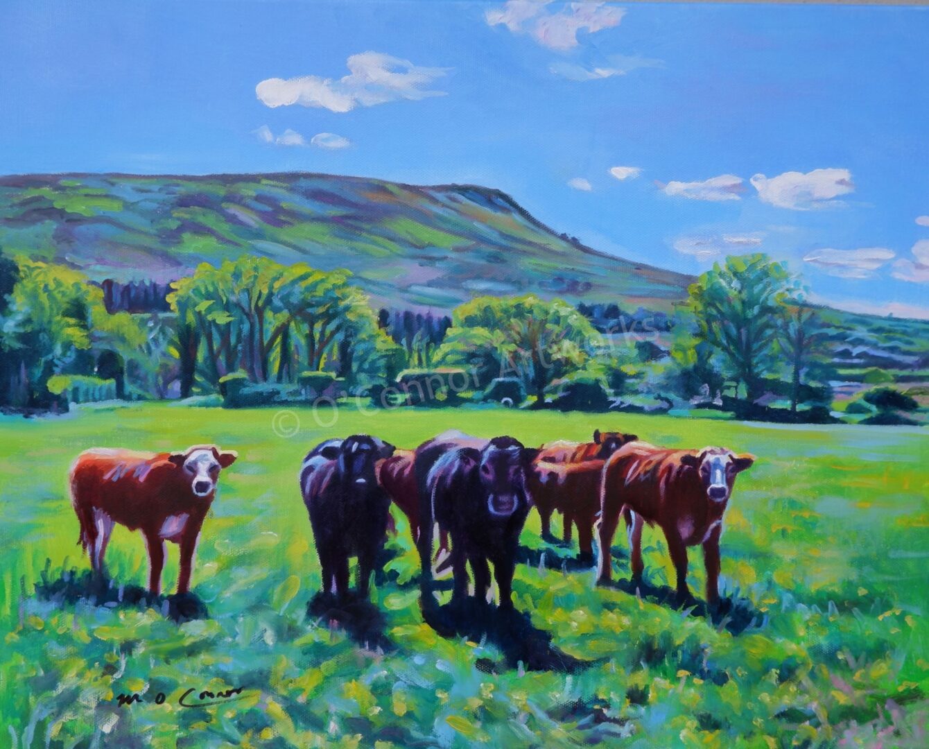 In this painting I wanted to evoke a peaceful pastoral scene as the sun rises, light falls across a herd of cattle grazing with the lovely patterns of light & shade shimmers on the landscape